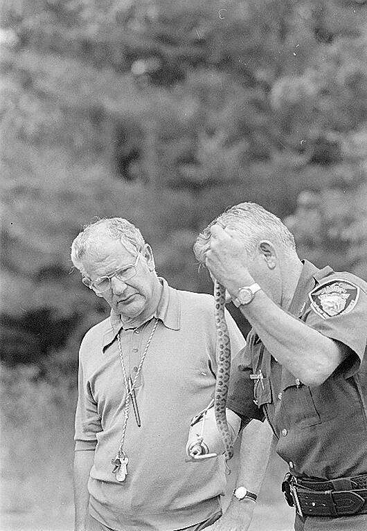 One of the main attractions at the Columbus Youth Camp was Brown County Conservation Officer Rex Kritzer and a copperhead snake. Kritzer shows the snake to Boys Club Director Gene Gurthet on June 25, 1974.