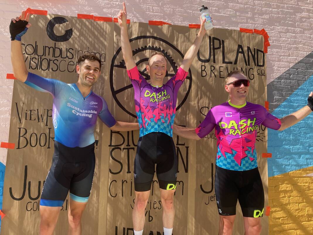 Columbus native Reid Wilson, center, stands atop the podium after winning the Men’s Category 2-3 race at Sunday’s Columbus Criterium. At left is runner-up Mitchell Clinkenbeard, and at right is third-place Chase Harker.