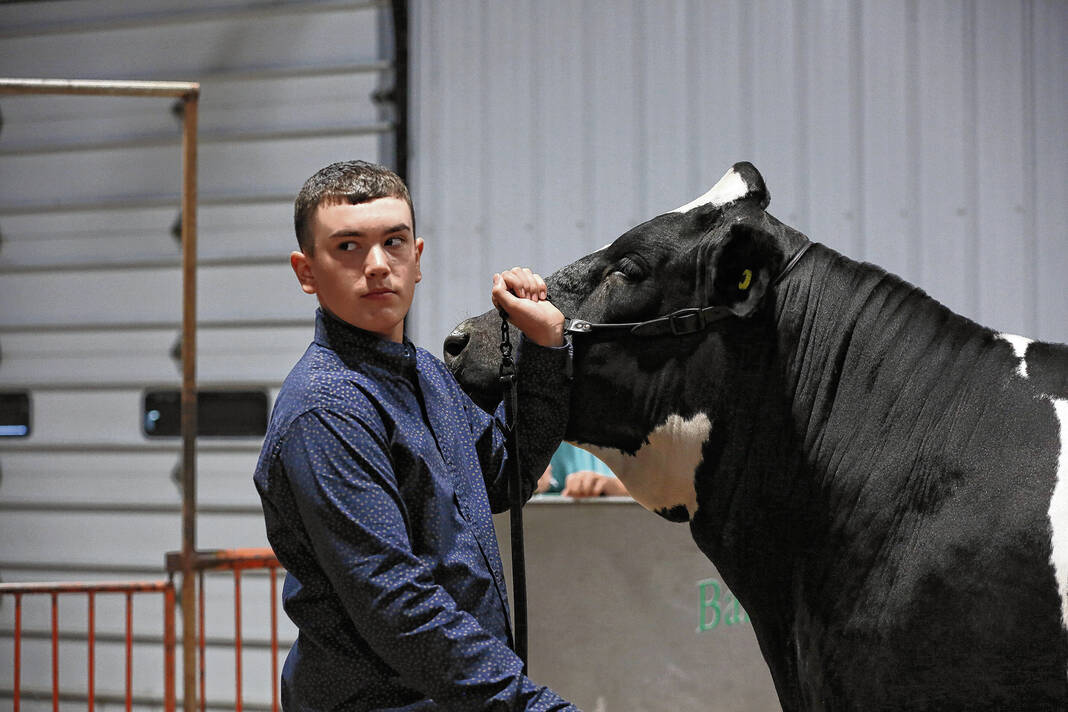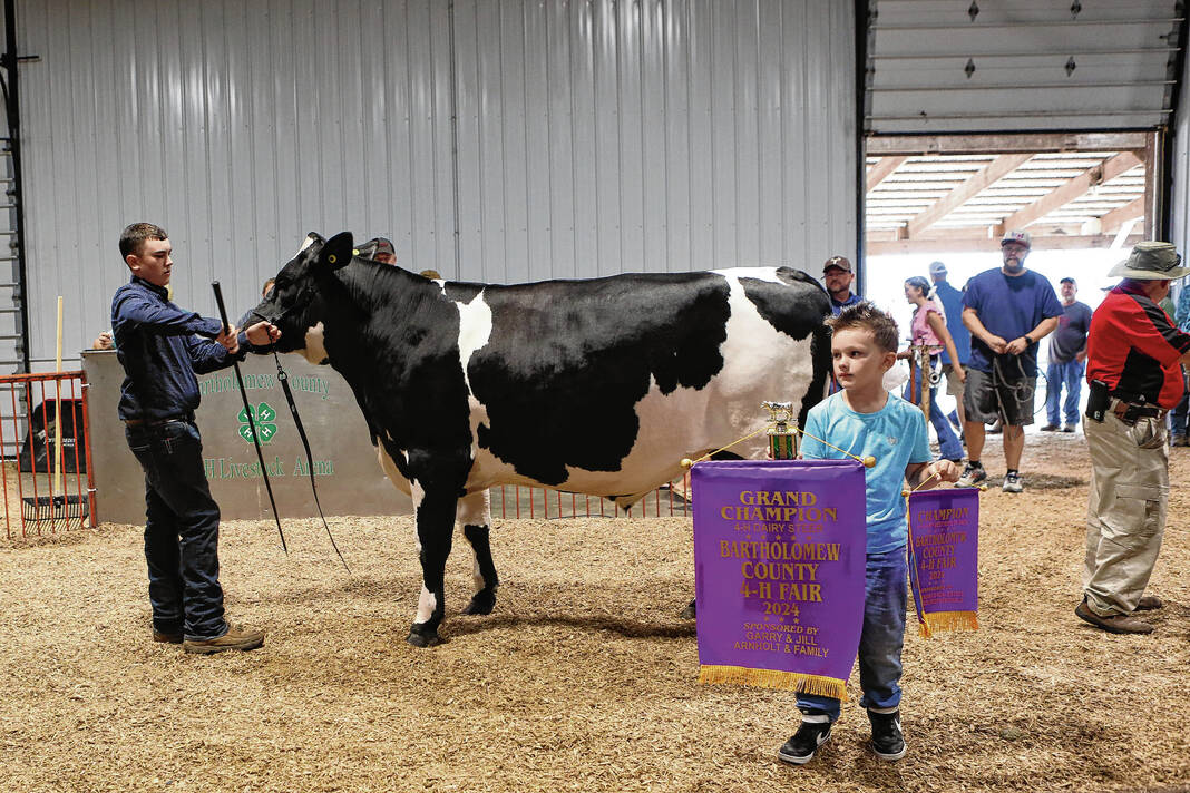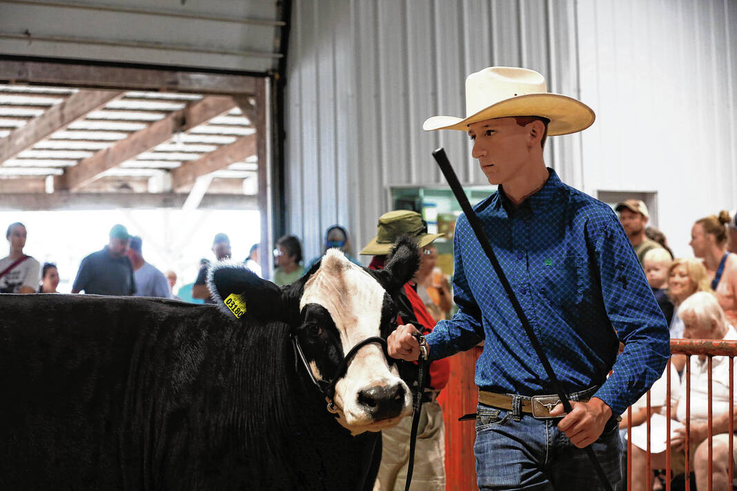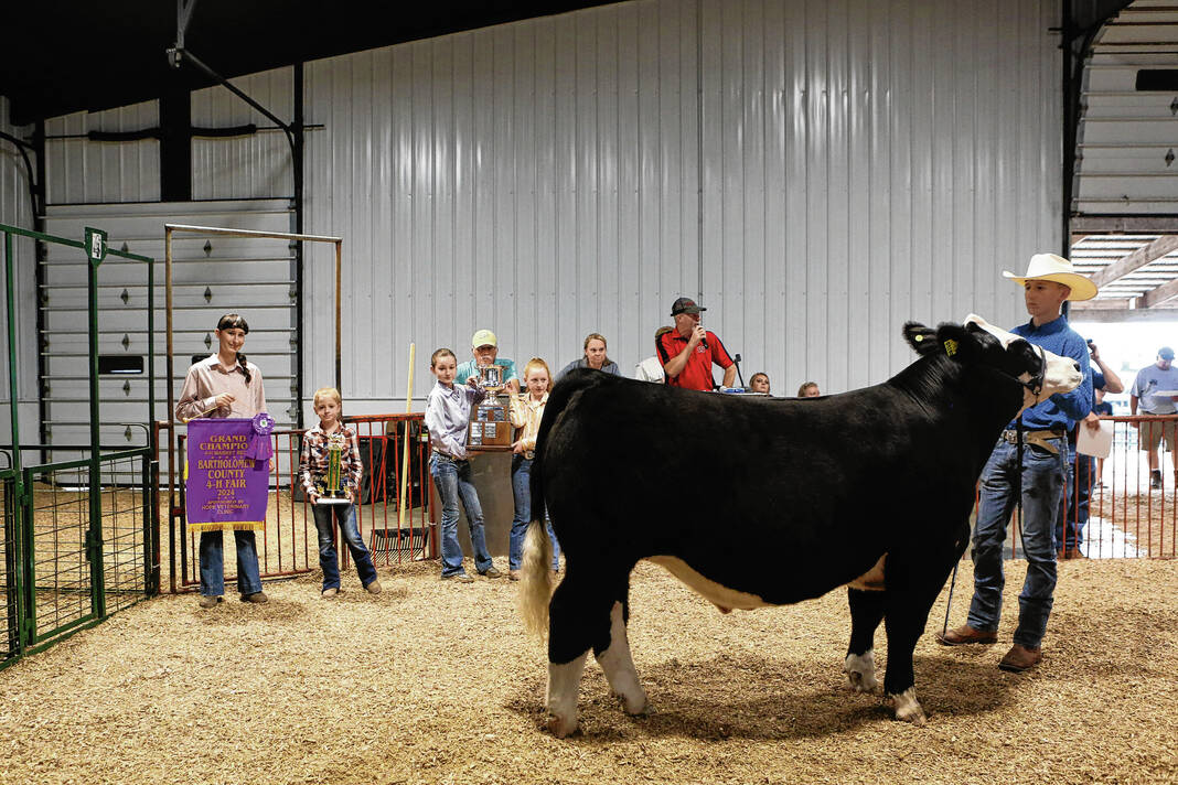Carla Clark | For The Republic Adyn Dempsey shows his Grand Champion Market Beef during the Bartholomew County 4-H livestock auction in the Livestock Pavilion at Bartholomew County 4-H Fairgrounds, Columbus, Ind., Saturday, June 29, 2024.