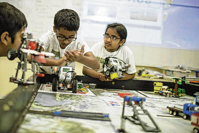 Aditya Madhukar uses a noise command to activate his Lego robot during a robotics camp at the Purdue College of Technology in June 2014.