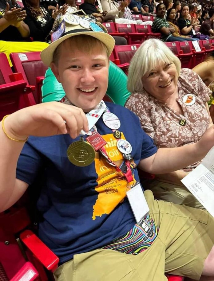 Aesop Birkemeier celebrated with his grandmother Carol Birkemeier after winning first place in the Junior Division in the National History Day Contest and performing at the Smithsonian Museum of American History.