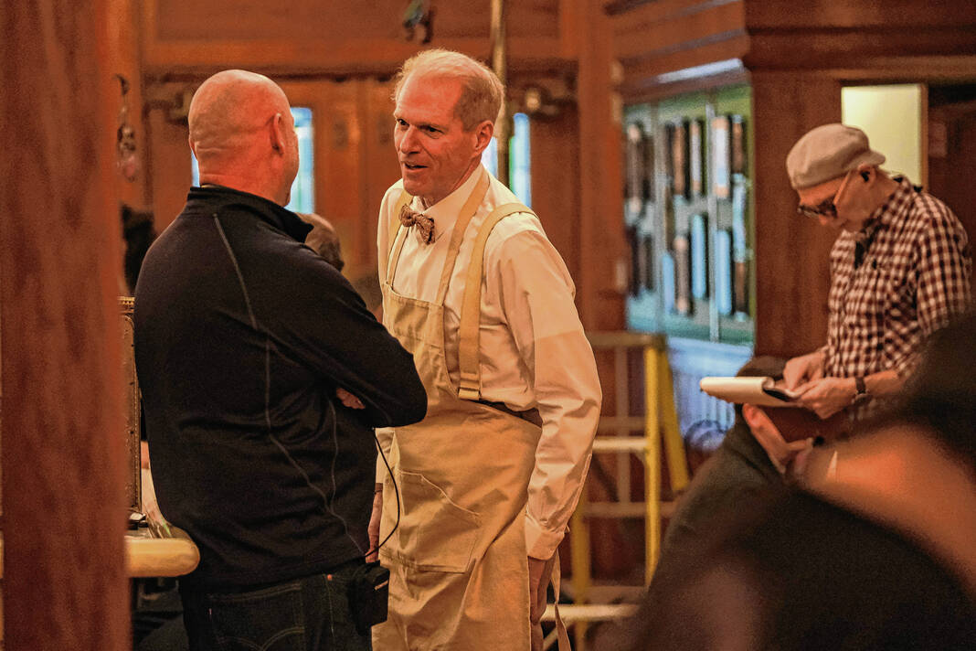 Mike Wolanin | The Republic Director Robert Moniot, left, talks with actor Noah Emmerich during a break in between shooting scenes at Zaharakos for “The Ice Cream Man” movie in Columbus in March 2023.