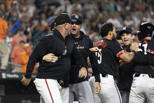 With one out, Holmes’ pitch hit Kjerstad around the ear flap. After a delay, Kjerstad was able to get up but left the game. Then things escalated, with Orioles manager Brandon Hyde walking toward the New York dugout and pointing, at which point Yankees catcher Austin Wells tried to restrain Hyde but benches and bullpens emptied.