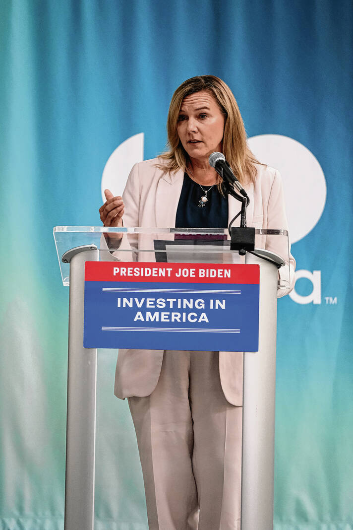 Mike Wolanin | The Republic Cummins Chair and CEO Jennifer Rumsey speaks during a press conference at Cummins Engine Plant in Columbus, Ind., Thursday, July 11, 2024. The Department of Energy announced they’ve awarded Cummins a $75 million grant to convert some of the manufacturing space at the plant to produce zero-emissions components and electric powertrain systems.