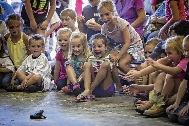 Children react as a frog gets a little too close during the frog jumping competition at the 4-H Fair on July 11, 2014, at the Bartholomew County Fairgrounds.