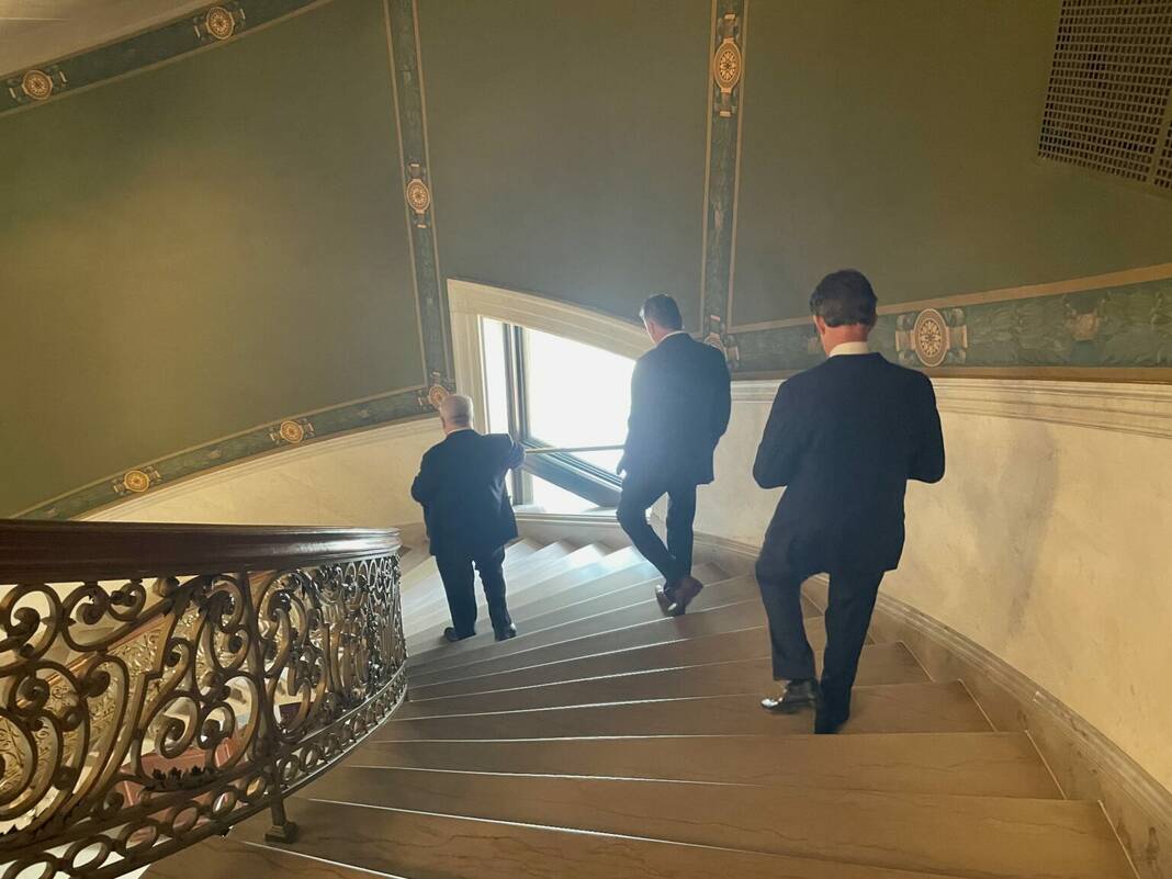 Former Rep. Sean Eberhart, center, exits the U.S. Courthouse in Indianapolis after a sentencing on Wednesday, July 10, 2024. He is accompanied by his counsel and a friend. (Leslie Bonilla Muñiz/Indiana Capital Chronicle)