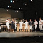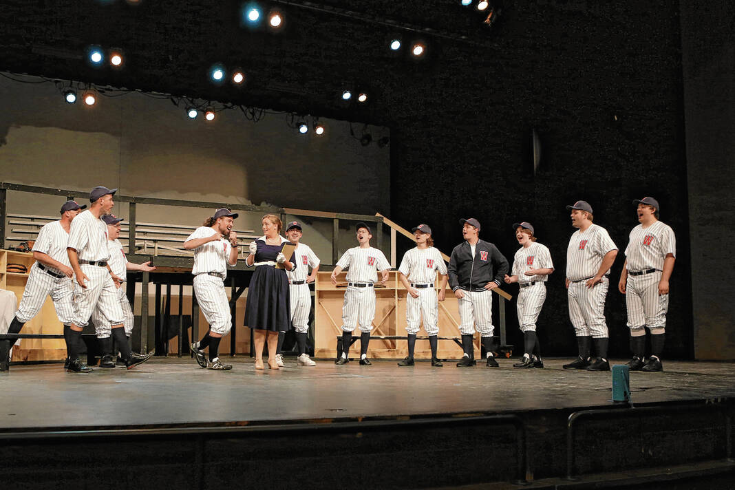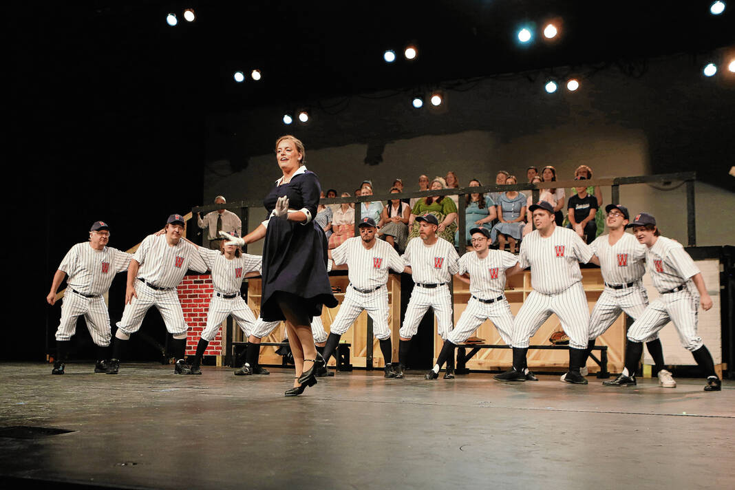 The Washington Senators baseball team players sing “Heart” to Ally Parker, portraying reporter Gloria Thorpe, during a rehearsal for the Mill Race Theatre Company production of “Damn Yankees” on July 10.