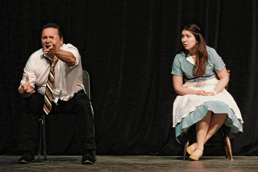 Colin Hammond (Joe Boyd) yells at the television while watching a Washington Senators baseball game while Lexi Schneider (Meg Boyd) looks on during a rehearsal for the Mill Race Theatre Company production of “Damn Yankees” in the Judson Erne auditorium at Columbus North High School on July 10.
