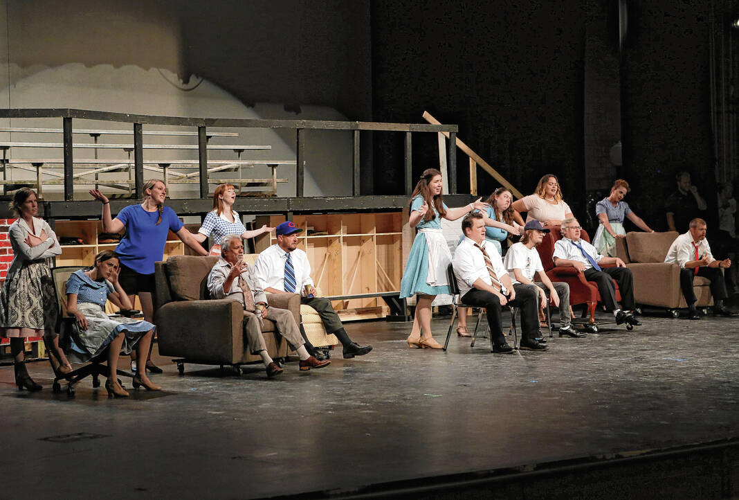 Lexi Schneider as Meg Boyd, center, and others sing “Six Months Out Of Every Year” during a rehearsal for the Mill Race Theatre Company production of “Damn Yankees” in the Judson Erne auditorium at Columbus North High School on July 10.