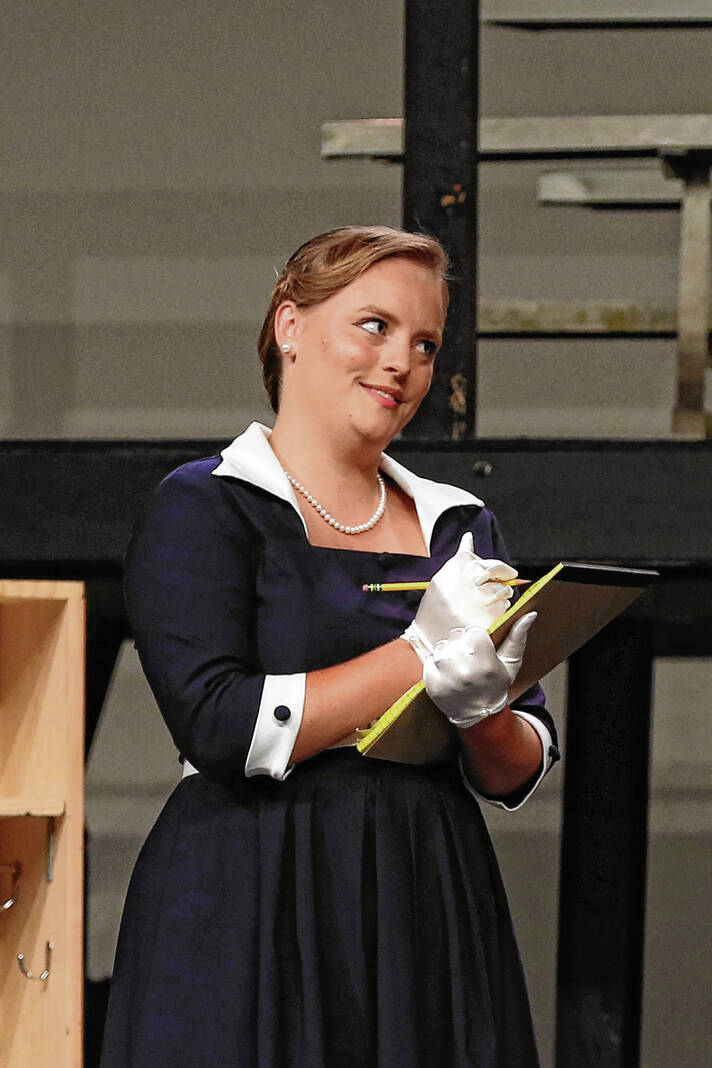 Ally Parker as reporter Gloria Thorpe rehearses a scene for the Mill Race Theatre Company production of “Damn Yankees” in the Judson Erne auditorium at Columbus North High School on July 10.