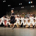Ally Parker as reporter Gloria Thorpe and the Washington Senators baseball team players perform “Shoeless Joe” during a rehearsal for the Mill Race Theatre Company production of “Damn Yankees” in the Judson Erne auditorium at Columbus North High School on July 10.