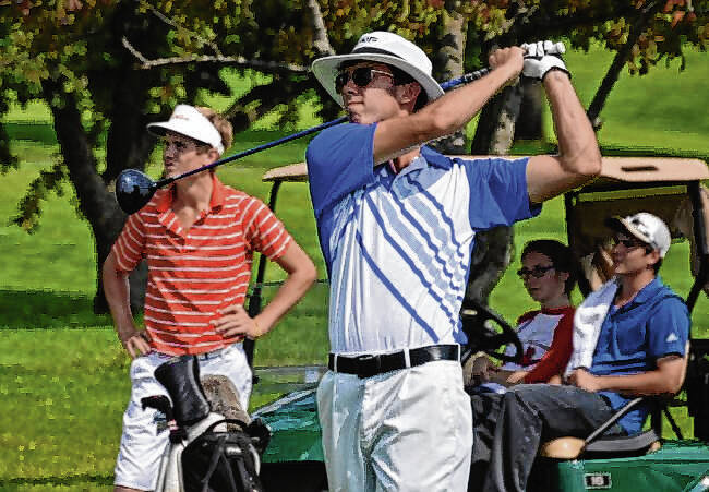 Jake Coffey watches the flight of his tee shot on the playoff hole of the Columbus Men’s Golf Tournament at Otter Creek Golf Course on July 19, 2014. Coleman Glick, left, looks on.