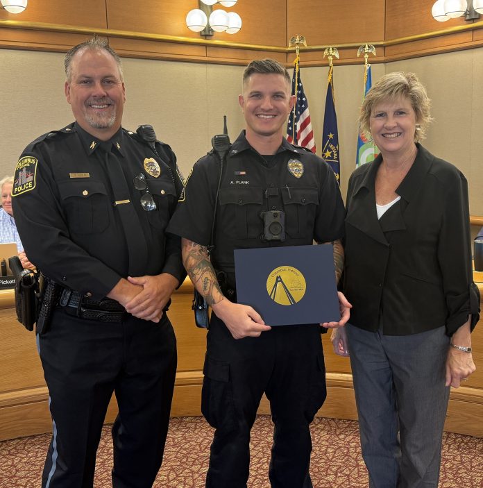 Plank was joined by his family as more than 20 Columbus police officers looked on during the Board of Public Works and Safety meeting Tuesday morning as he received a commendation in council chambers at city hall.