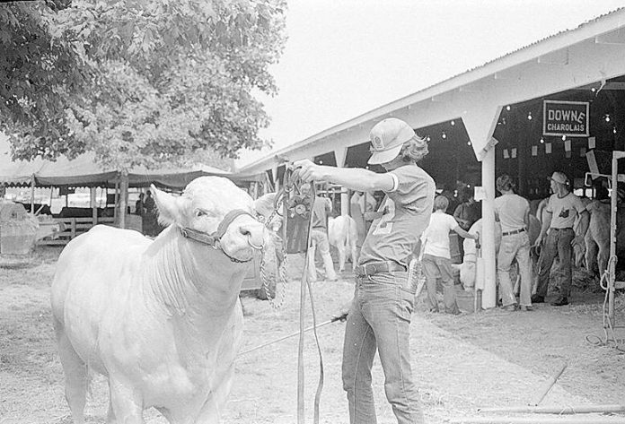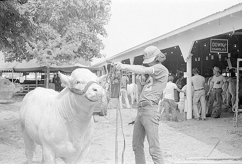 Leading the animal back to its stall, Howard Downey, 17, of Hope, stops for a picture of his grand champion Charolais bull. Downey showed the bull in the open class of beef judging for his family on July 29, 1974.