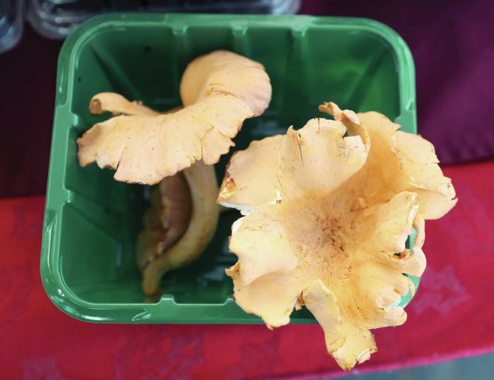 Carla Clark | For The Republic Chanterelle mushrooms foraged by Mary Lou Nay for sale at her booth during the Columbus Farmers Market, Columbus, Ind., Saturday, July 20, 2024