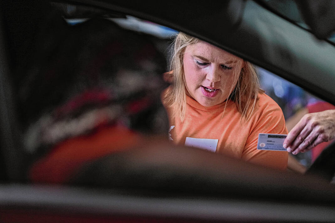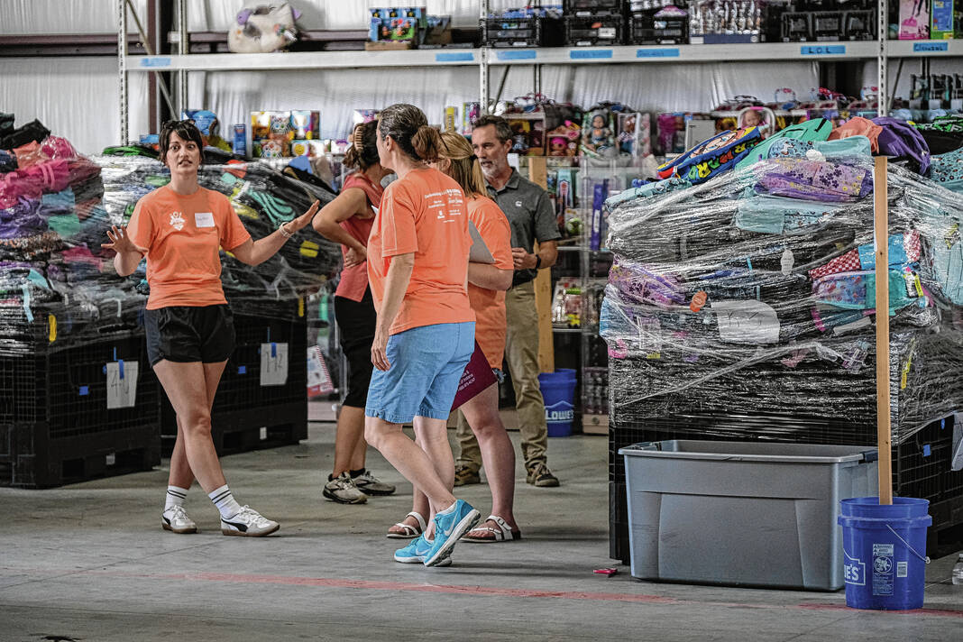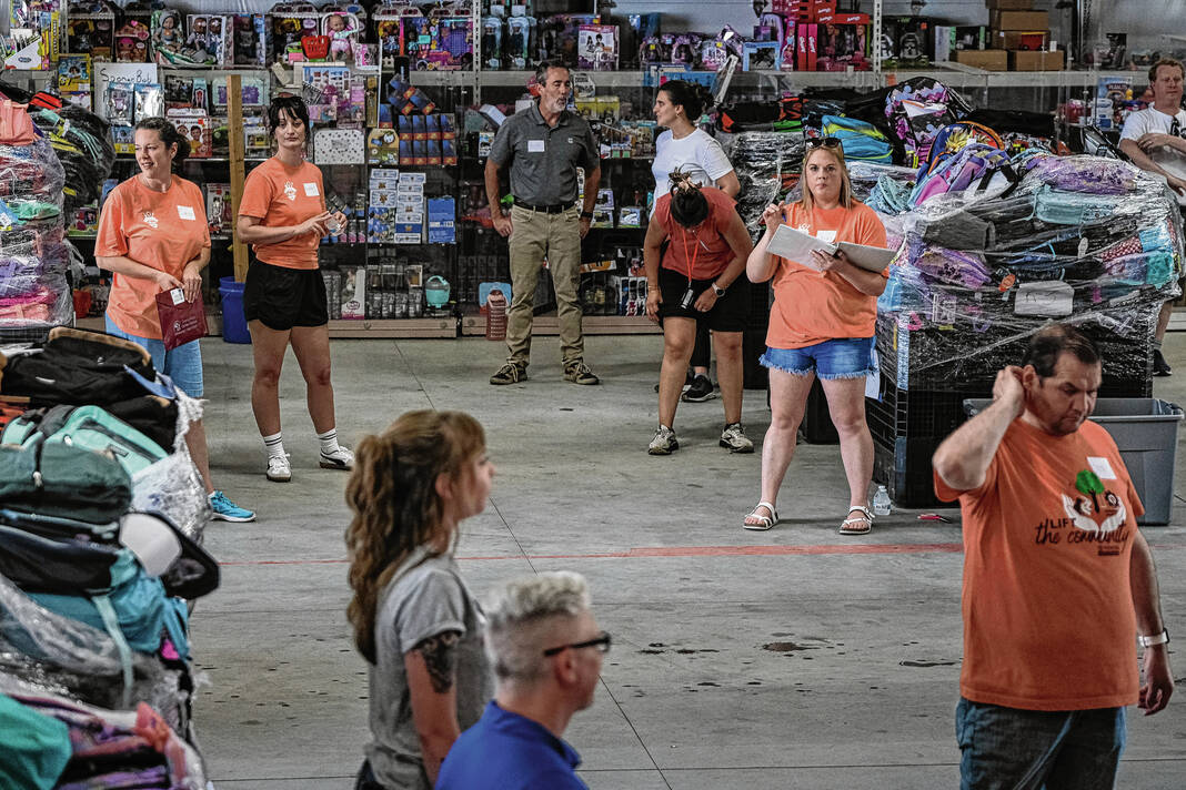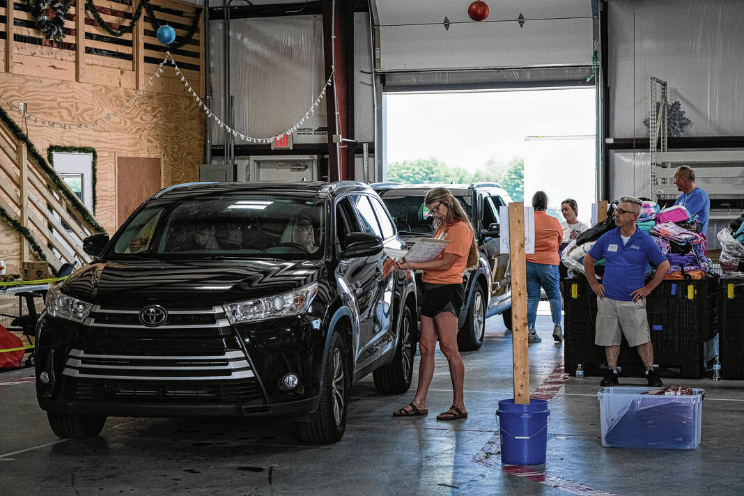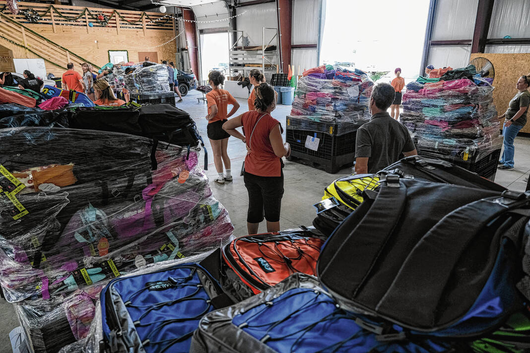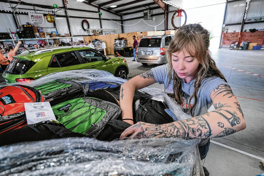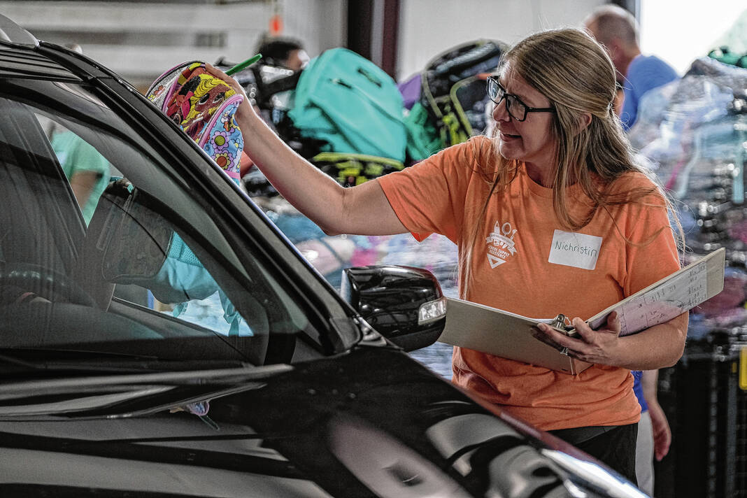 Mike Wolanin | The Republic Volunteers hand out backpacks full of school supplies during the annual School Supply Assistance Program in Columbus, Ind., Thursday, Aug. 1, 2024.