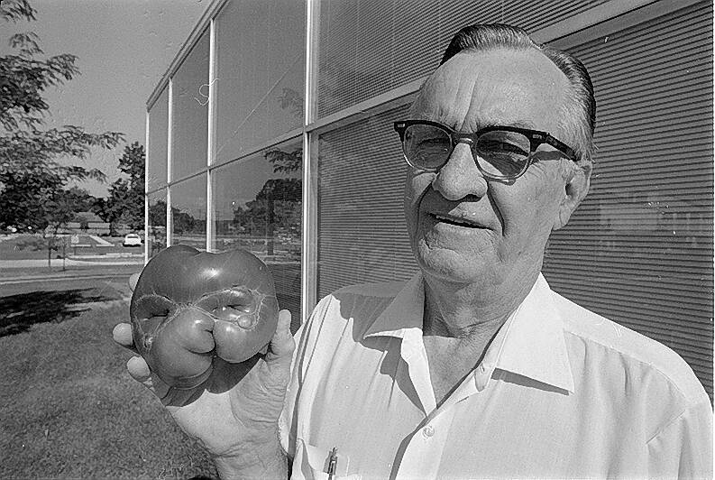 H.G. Schepman, of Columbus, holds up a homegrown tomato that looks like it’s wearing glasses on Aug. 2, 1974.