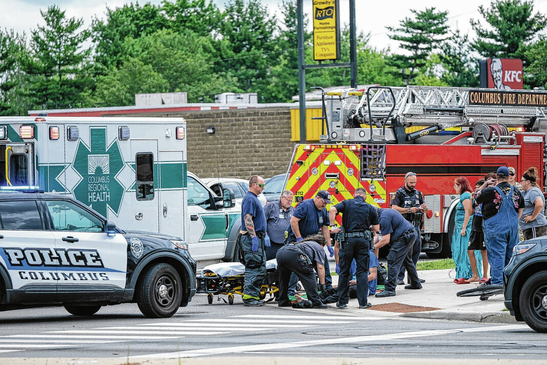 Mike Wolanin | The Republic Columbus police and firefighters, and ambulance personnel from Columbus Regional Health, work at the scene of a collision between a vehicle and a bicycle at 12:30 p.m. Friday on National Road in front of Steak n Shake.