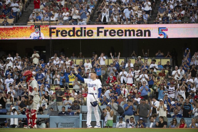 Freeman received a standing ovation in his first at-bat. The Phillies joined the applause from their dugout. The pitch clock was stopped as he stepped out of the batter’s box, removed his helmet and waved to the crowd, then touched his right hand to his heart.
