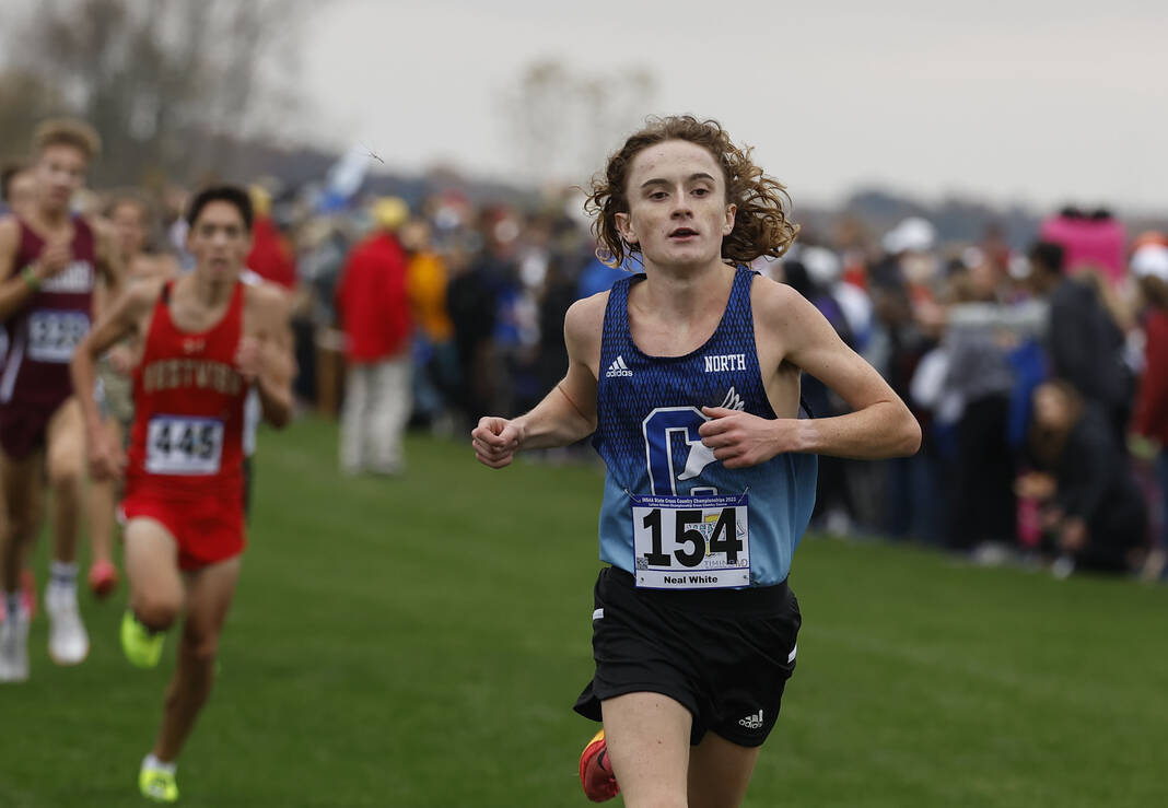Columbus North’s Neal White approaches the finish line at the Boys Cross Country State Finals Oct. 28, 2023 at LaVern Gibson Championship Cross Country Course in Terre Haute.