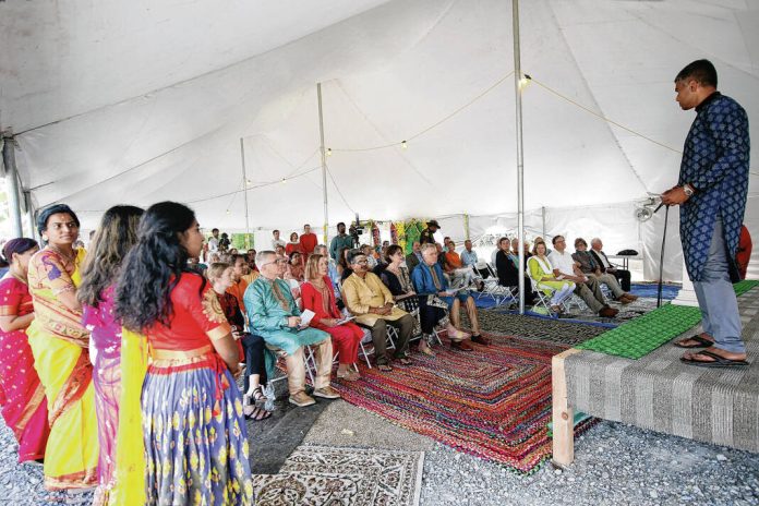 People listen to remarks by Rajkumar Subramanian during the inauguration celebration and community open house at the Sri Ganesh Mandir Hindu temple in Columbus on Aug. 28, 2022.