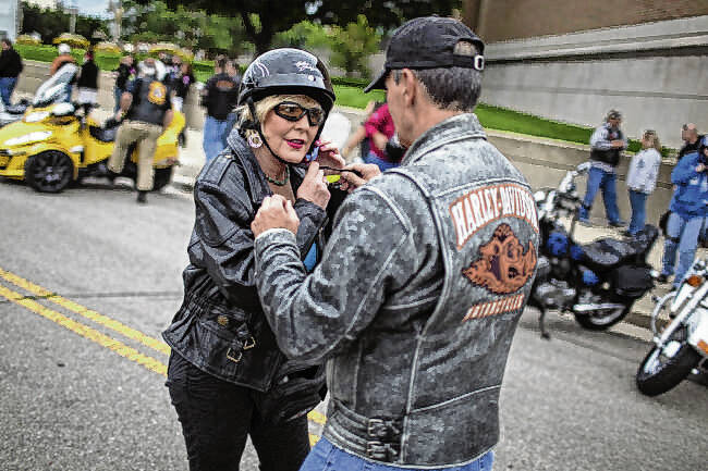 Greg Newhart helps Theresa Gregory fasten her helmet before the Mayor’s Motorcycle Ride on Aug. 16, 2014, outside City Hall.
