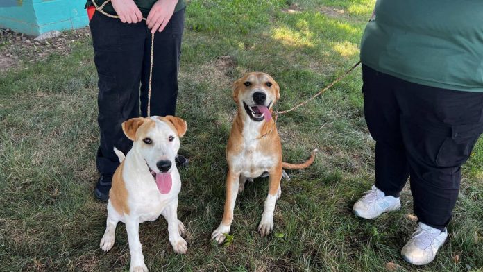 Big Dan and Little Ann came in together. Little Ann is an active, friendly girl who knows no stranger. Little Ann loves running around outside and is always on the lookout for a new adventure! She enjoys going for walks and learning new things. Little Ann is excited to show you how well she sits for a tasty treat. Big Dan is a sweet, calmer dog, who loves attention and leans into pets. He can be a little shy at first when meeting new people or in new situations but he warms up quickly.
