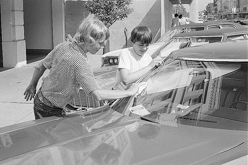Steve Henshaw, left, and Bruce Gordon, right, wash car windows on Aug. 20, 1974, free of charge in downtown Columbus as part of their civic service project for the York Rite Chapter of DeMolay.