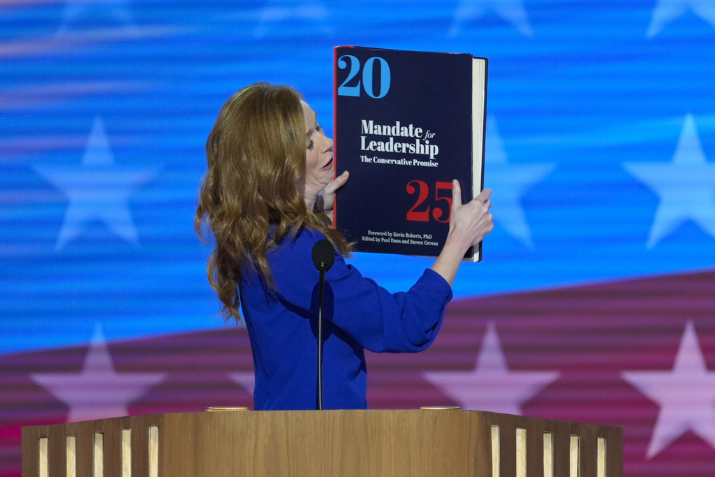 Mallory McMorrow, a 37-year-old state senator from Michigan, brought out a giant copy of the roughly 900-page “Mandate for Leadership” on Monday night, the first evening of the Democratic National Convention in Chicago. She slammed it on the lectern, then made an expression to signal how heavy it was as she opened to start reading.