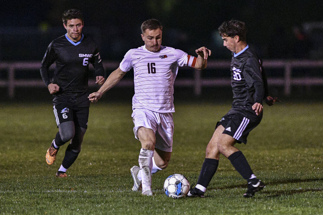 IU Columbus’ Jon Michael Bright (16) attempts to dribble past Saint Mary-of-the-Woods’ Jamie Gayol during a soccer match Oct. 19 at Richard Wigh Soccer Complex.