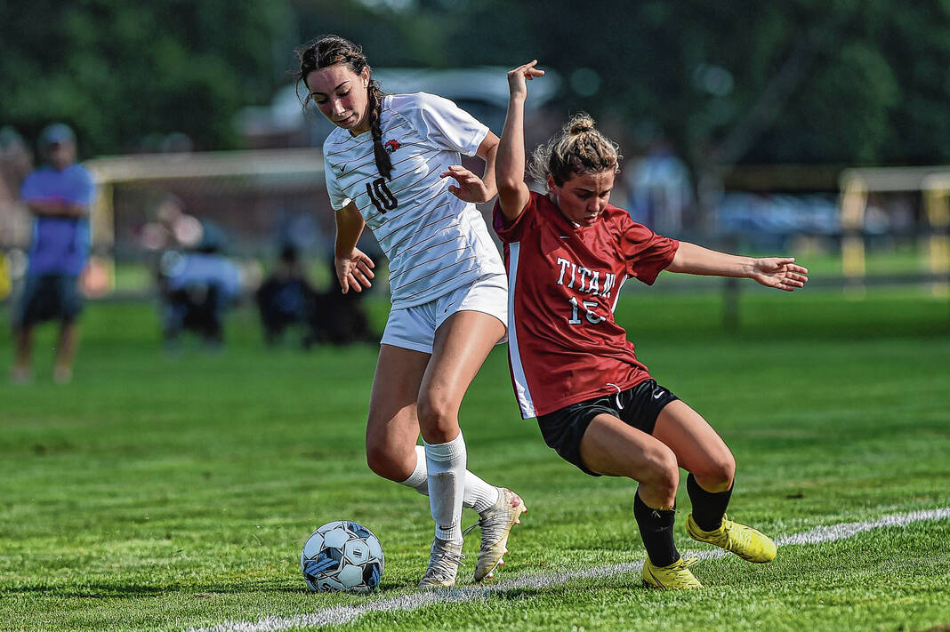 IU Columbus’ Lily Campbell, left, shields the ball from IU South Bend’s Cassidy Ryan during the first game of the Crimson Pride’s inaugural season Aug. 18, 2023 at Richard Wigh Soccer Complex.