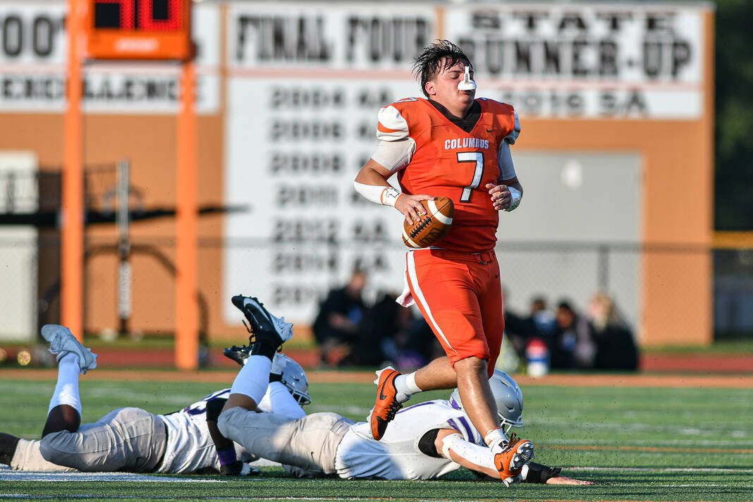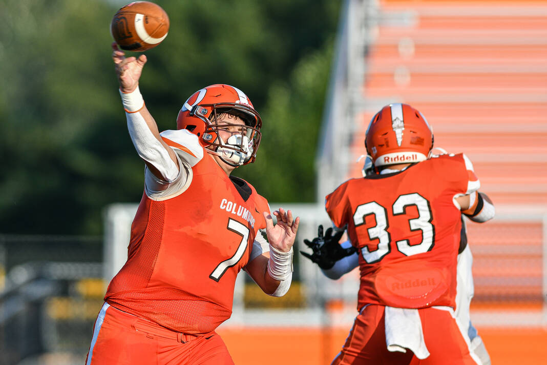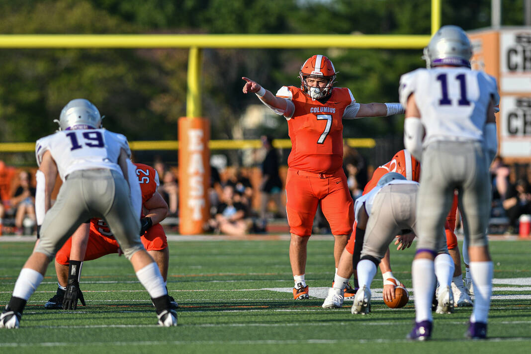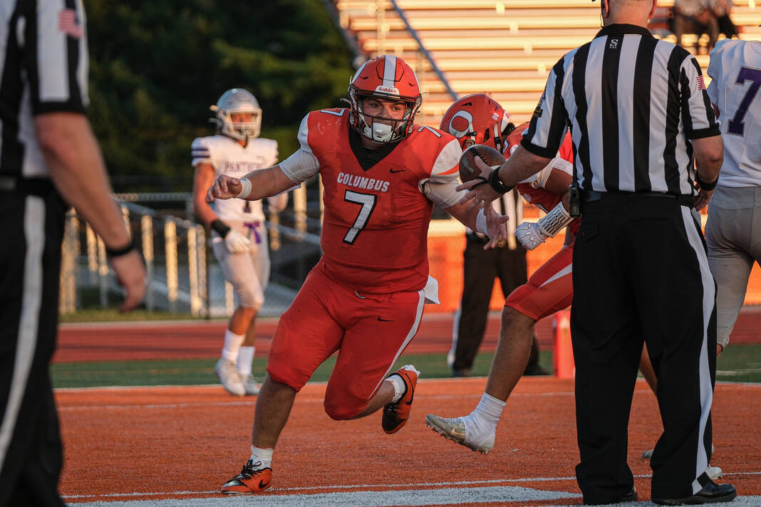 RECEIVING — Bloomington South: Giles 5-58, Parker 4-32, Rylan Stikeleather 2-20, Samuel Moore 1-12, Gill 1-5, Azcui 2-0. Columbus East: Keaton Lawson 7-74, Jared Brooks 4-35, Kamden Shelley 3-32, Jax Siegman 1-9, Cam Herron 1-5.