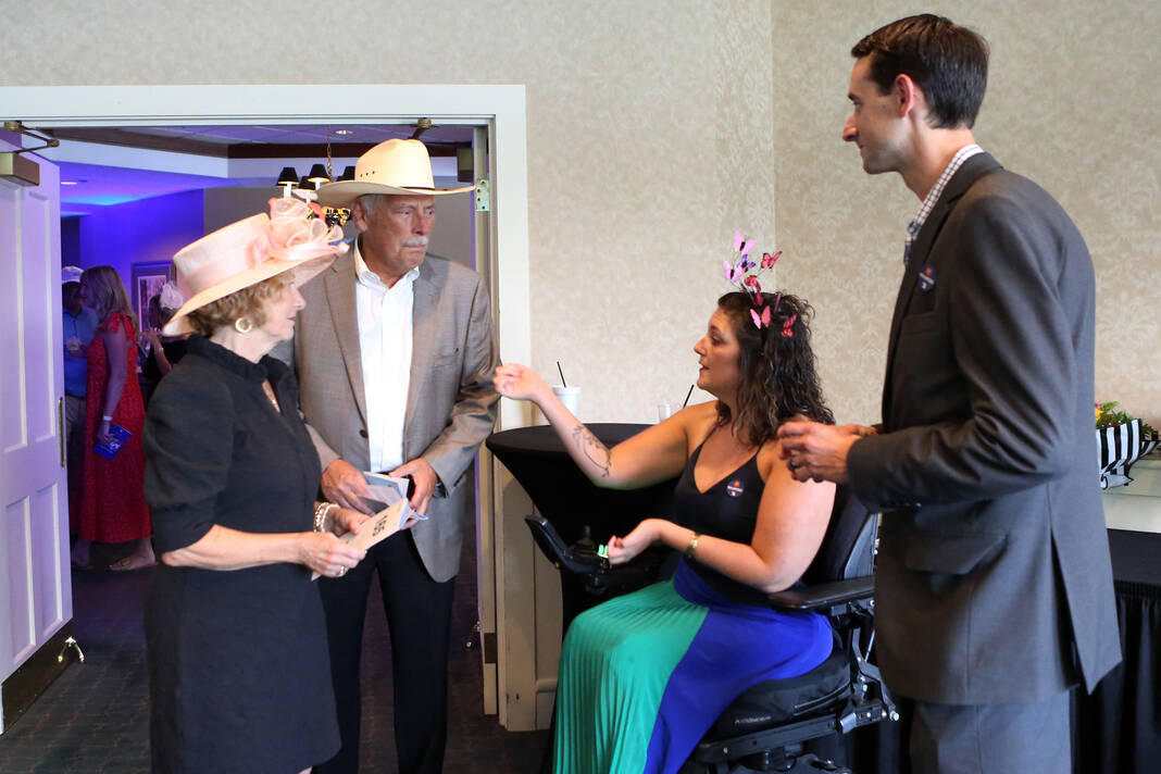 Carla Clark | For The Republic Amy Boerger, at left, visits with artist and sculptor Robert Pulley during the Columbus Area Arts Council fundraiser the Uncommon Cause, “Hats Off to the Arts”, at Harrison Lake Country Club, Columbus, Ind., Saturday, August 24, 2024.