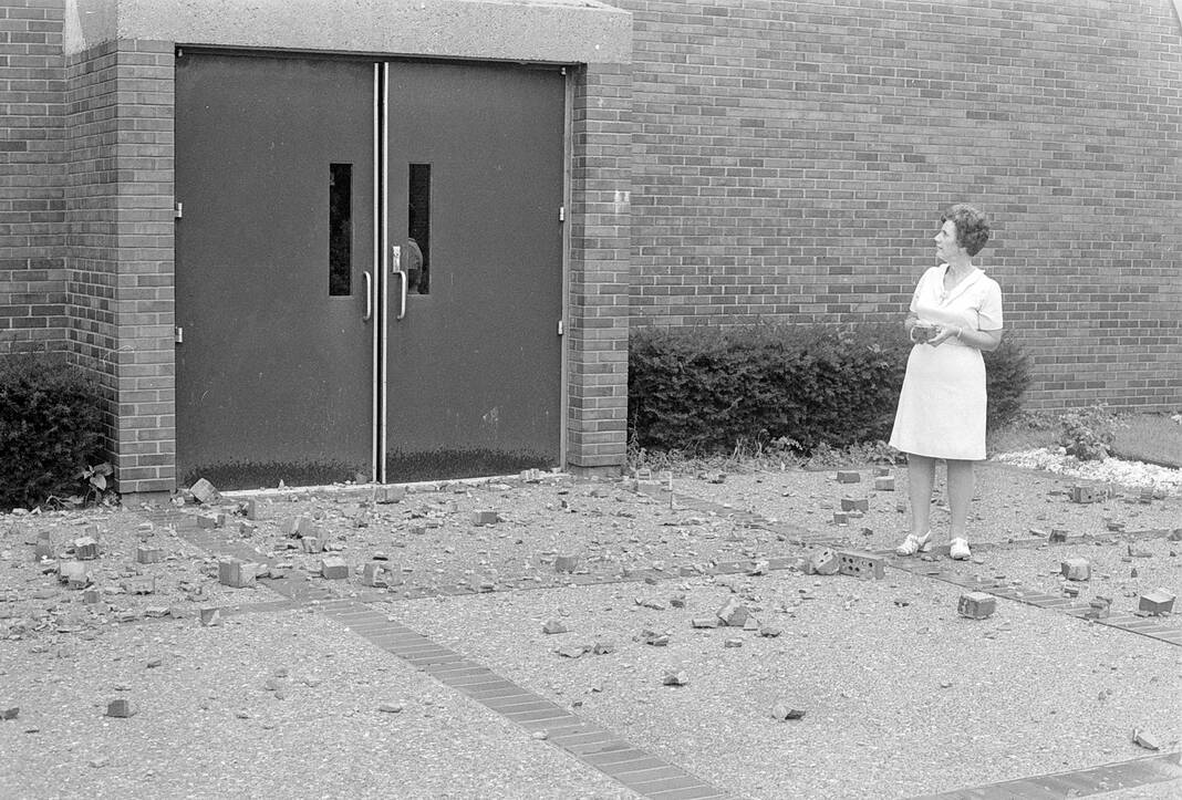 Bricks from the steeple of the Four Seasons Retirement Center’s chapel surround Assistant Administrator Mrs. John Doty on Aug. 28, 1974. Lightning struck the tower early in the day but no injuries were reported.