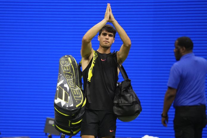 NEW YORK (AP) — After double-faulting to fall behind two sets to none — a deficit he’s never overcome — in the second round of the U.S. Open on Thursday night, Carlos Alcaraz slung his equipment bag over a shoulder and trudged toward the locker room.