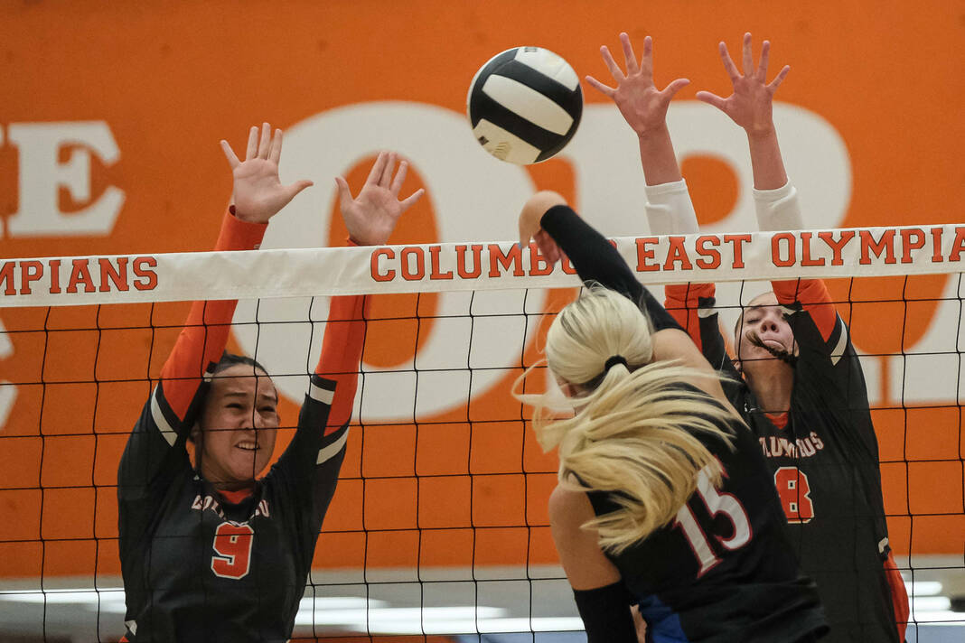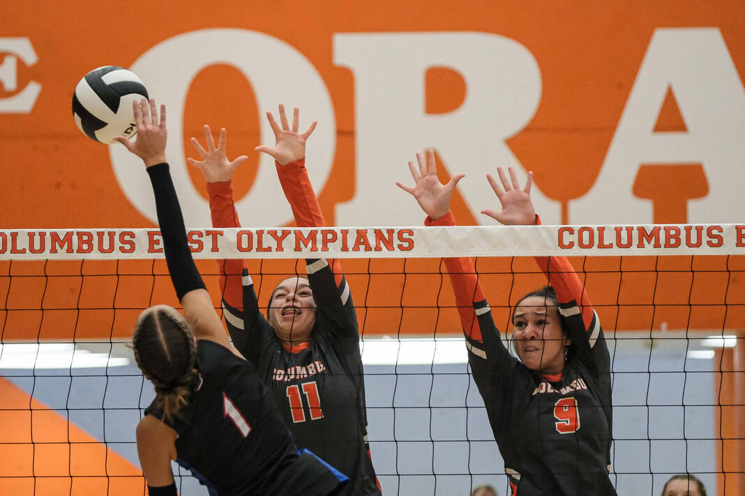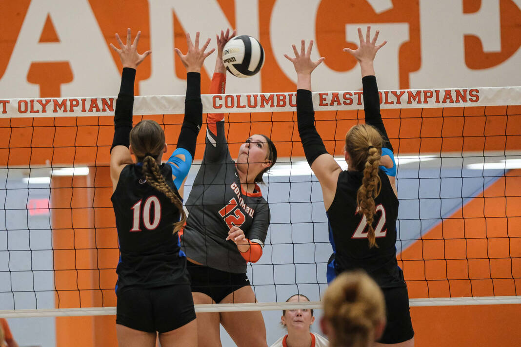 Jennings County’s Sydney Kegley, center, and Addison Martin go up to try to block against Columbus East’s Chandler Harris, left, during a volleyball match at Columbus East High School in Columbus, Ind., Tuesday, Sept. 3, 2024.