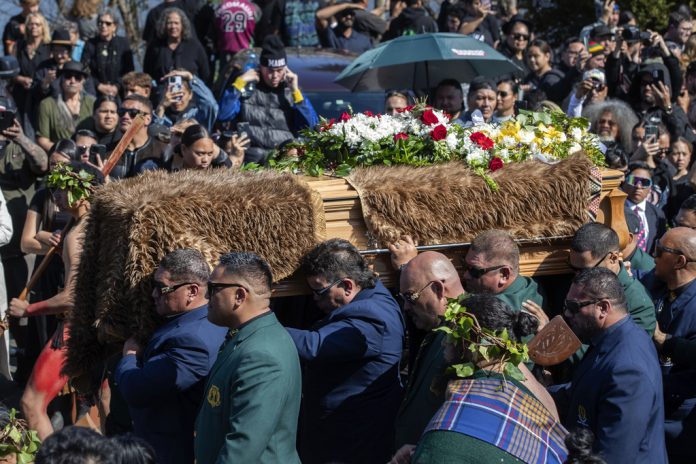NGĀRUAWĀHIA, New Zealand (AP) — They came in their thousands in the freezing dawn, parking cars far away and winding down rural roads on foot, children riding on their shoulders. They arrived in mourning black with crowns of ferns and kawakawa leaves, bone carvings or wedges of deep green pounamu -– New Zealand jade -– resting on their chests.