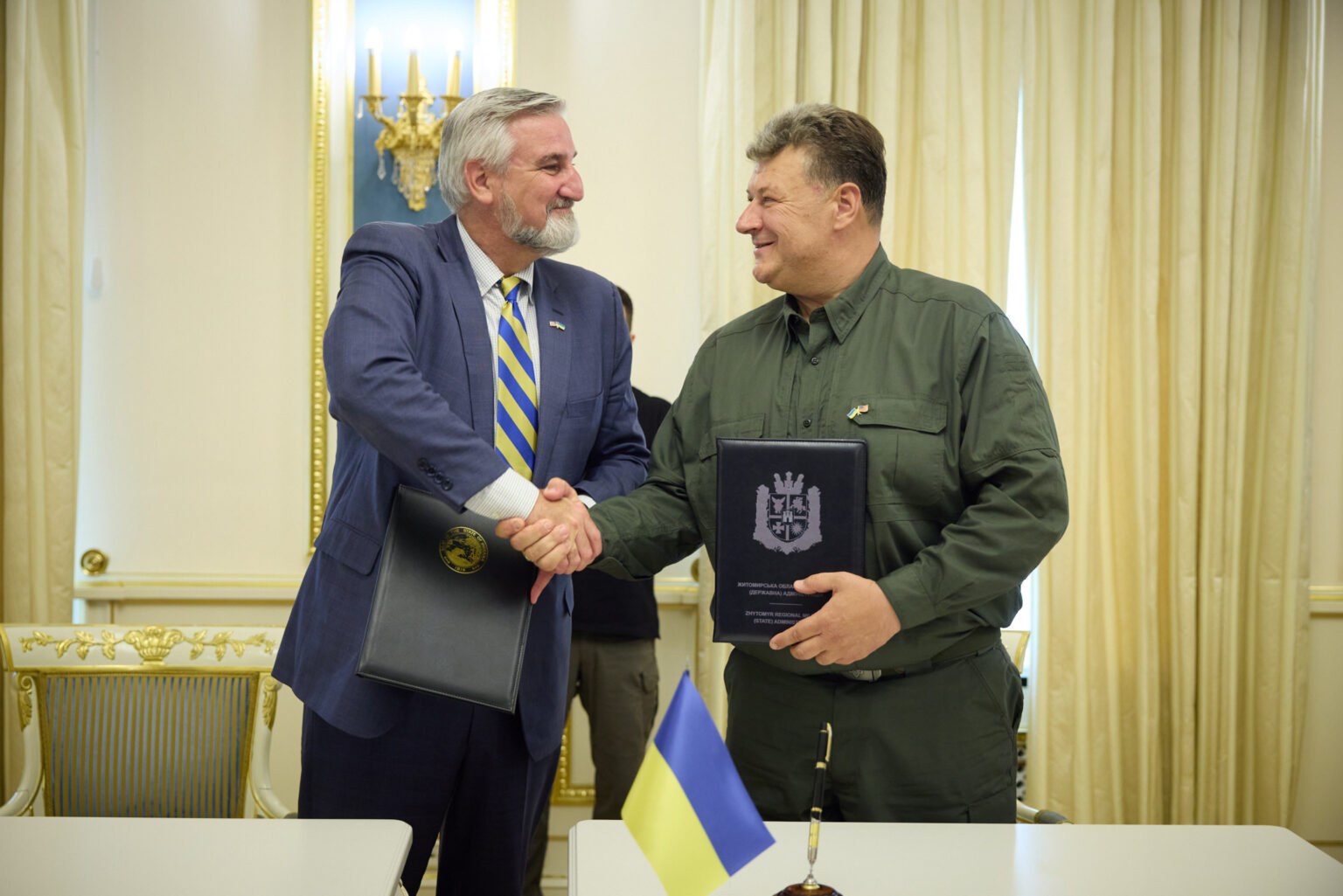 Holcomb and Zhytomyr Gov. Vitaliy Bunechko inked their signatures with Ukrainian President Volodymyr Zelenskyy looking on.