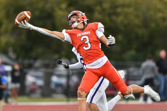 Columbus East’s Keaton Lawson, in orange, makes a catch while covered by Seymour’s Jackson Brock during a game at Columbus East High School in Columbus, Ind., Friday, Sept. 6, 2024.