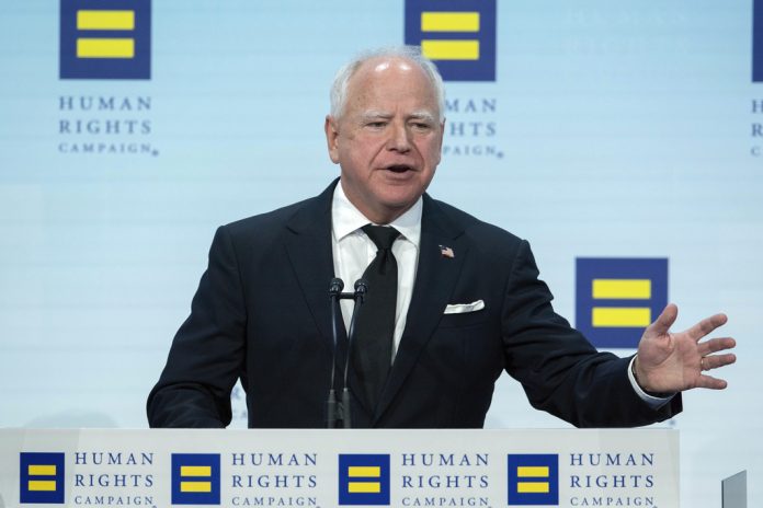WASHINGTON (AP) — Minnesota Gov. Tim Walz touted Vice President Kamala Harris’ record of defending LGBTQ+ rights on Saturday night, pledging to a supportive crowd that she will advance their cause if elected president.