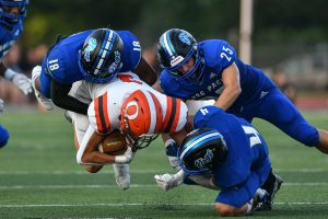 Columbus North’s Mykel Jones (18), Sam Perry (25) and Jackson Haston (4) tackle Columbus East’s Keaton Lawson during the annual rivalry football game between the two schools at Columbus North High School in Columbus, Ind., Friday, Aug. 30, 2024.