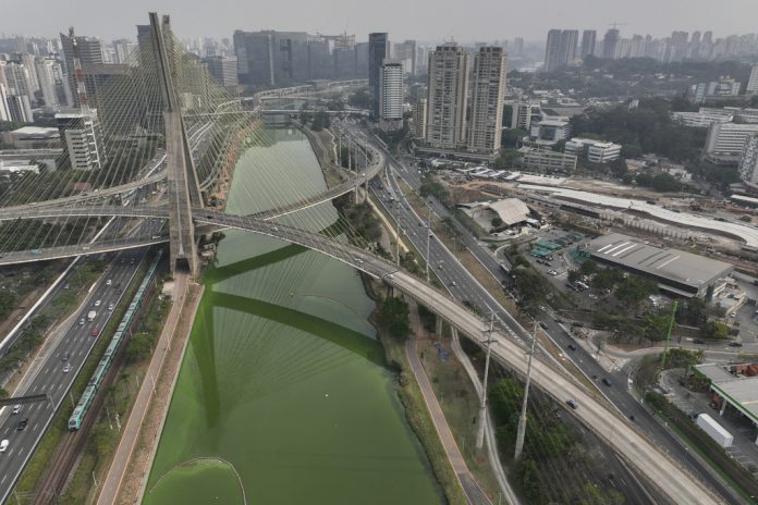 The state’s environmental authority attributes the Pinheiros River’s new green hue to an algae bloom, the result of severe drought that has significantly lowered water levels. The phenomenon was visible starting Monday and continued Tuesday. Those same days, the city suffered smoke-filled air, which the agency attributed to a hot, dry mass complicating the dispersal of pollutants originating in forested areas with ongoing wildfires.