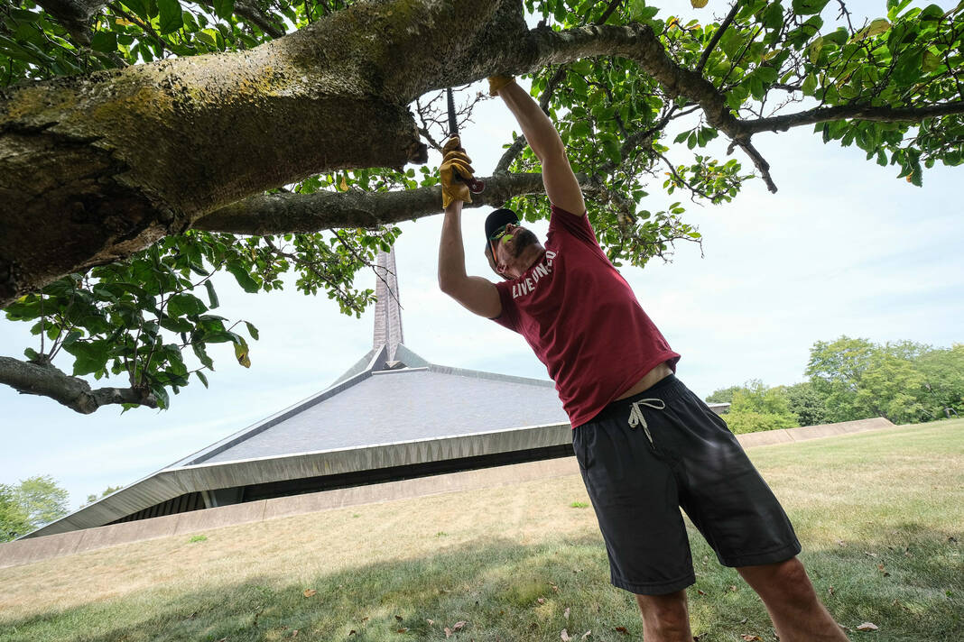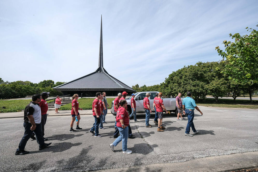 A group of 15 Cummins Inc. Off Highway employees gathered at the former North Christian Church building, now the property of the Bartholomew County Public Library, for basic landscaping on architect Dan Kiley’s 13-acre spread on Tipton Lane in Columbus.