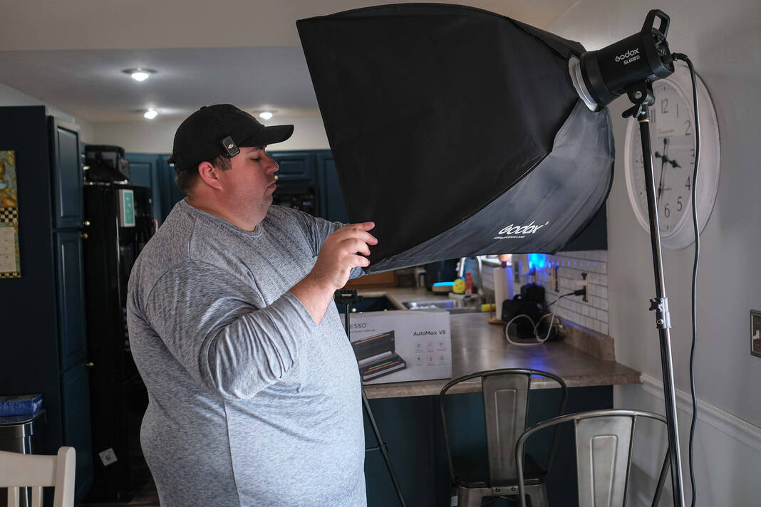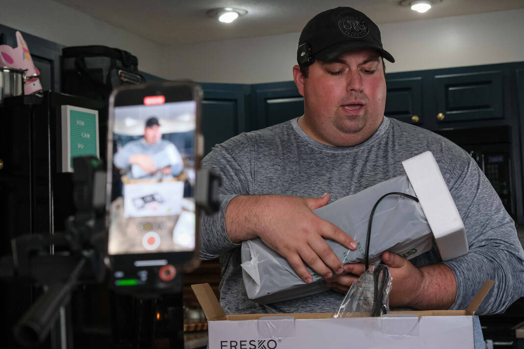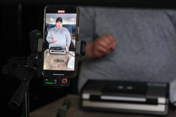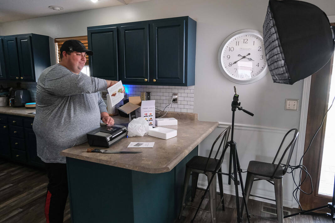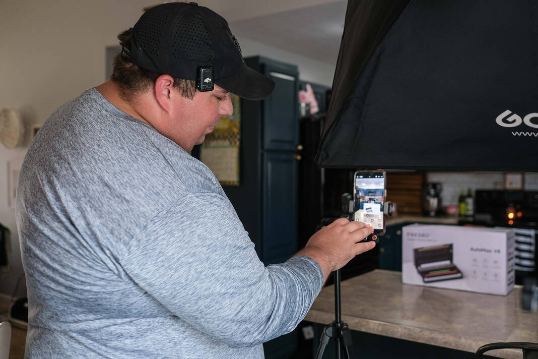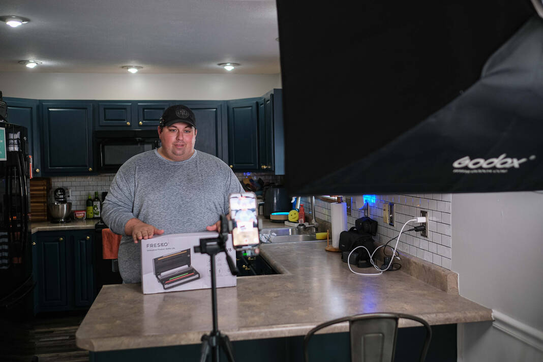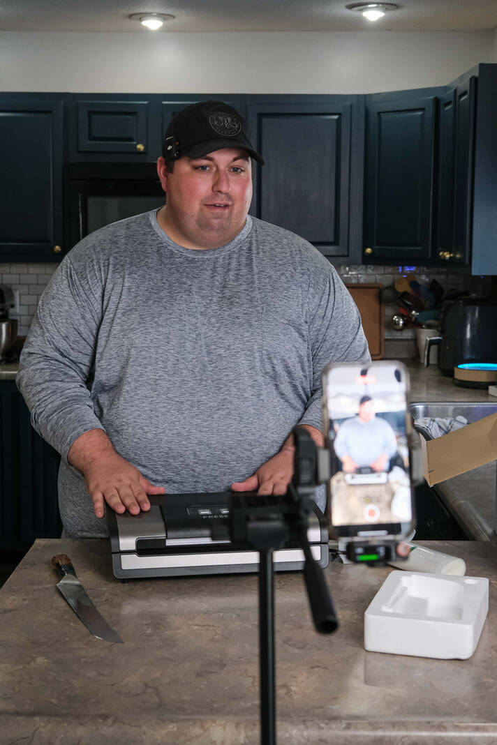 Content creator Justin Holmes shoots a video reviewing a vacuum sealer at his home in Greensburg on Thursday. Holmes, a Columbus East graduate, is known on various social media platforms such as TikTok, Instagram and Facebook as Holmes Cooking. Holmes has more than 3 million followers on all platforms.