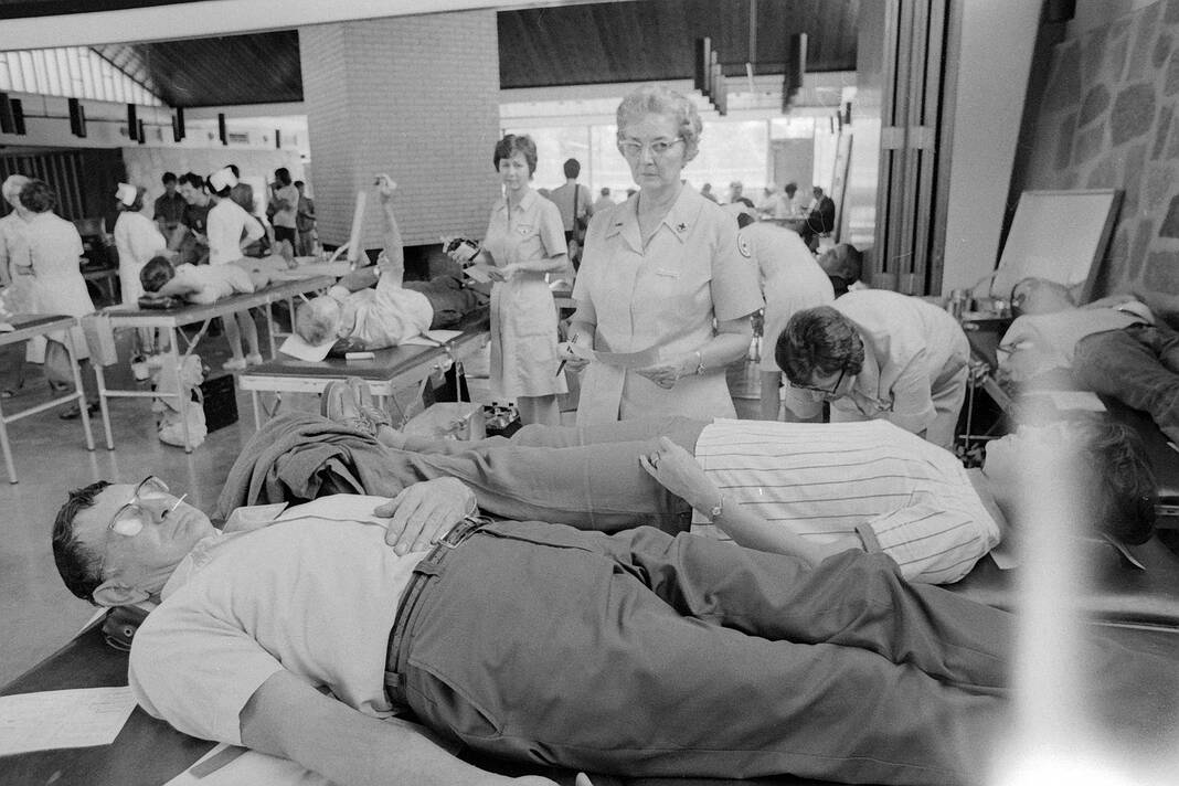 Pauline Irvine, center, watches while William Cartner donates blood at Lincoln Center on Sept. 17, 1974. At back center, Alice Weisenberger, local blood program director, prepares to take a pint of blood given by Hubert Lange to the Louisville Bloodmobile.