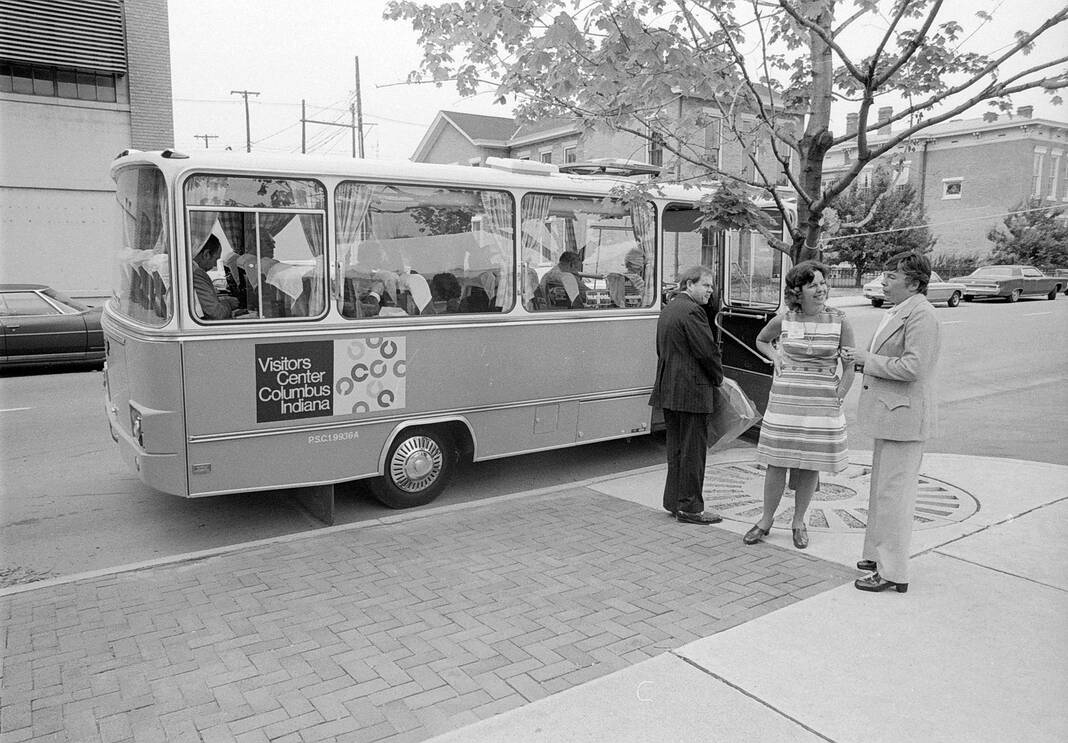 Natalie Fairhead, director of the Columbus Visitors Center, right, Robert Muckler, executive vice president of the Columbus Area Chamber of Commerce, and Sherry Stark, new Chamber board member, prepare to board the Visitors Center tour bus with other members of the tour on Sept. 20, 1974.