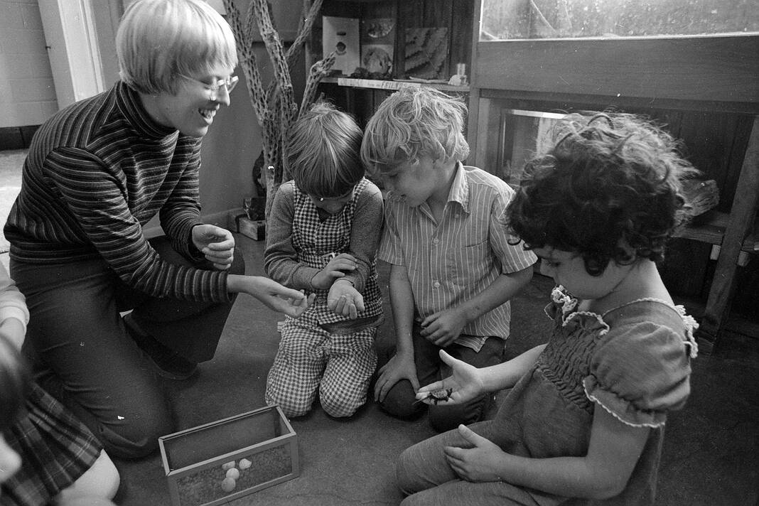 Karen Bock, Kent Elementary School librarian, shows students small snapping turtles that hatched in a terrarium in the room on Sept. 26, 1974.