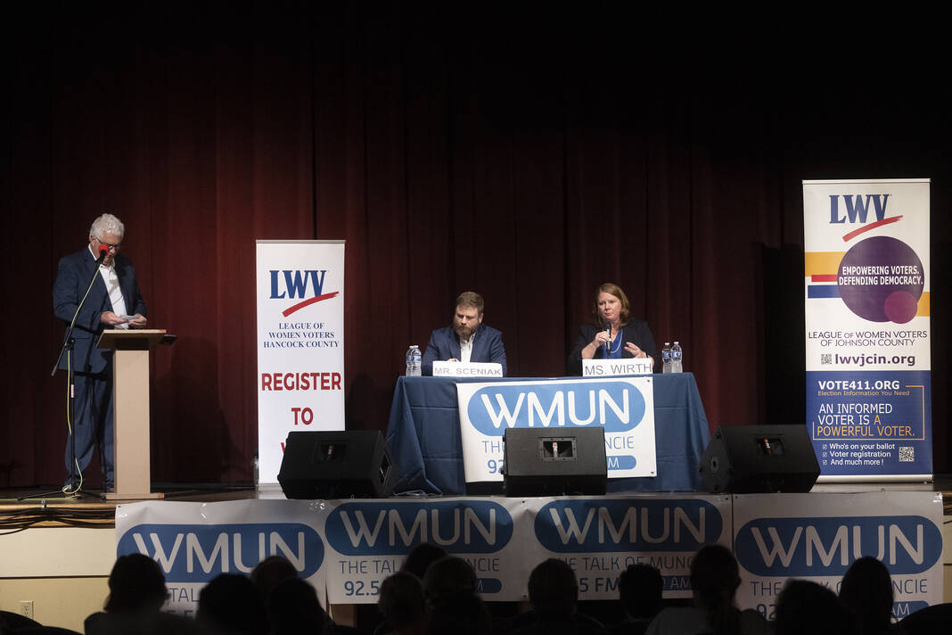 The League of Women Voters of Hancock County held a voter forum for the race for Indiana’s Sixth Congressional District on Wednesday night at the H.J. Ricks Centre For The Arts in conjunction with the LWV branches of Johnson County, Henry County and Indianapolis and Woof Boom Radio.