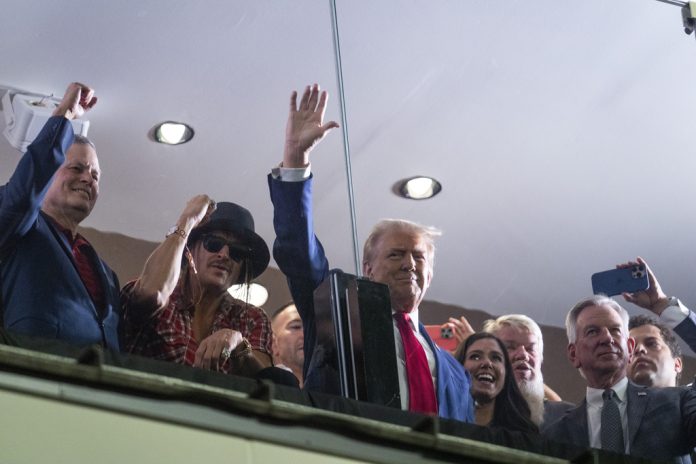 Joining the politicians in the suite were musicians Kid Rock and Hank Williams Jr. Herschel Walker, a Georgia football icon and failed Senate nominee in 2022, traveled in Trump’s motorcade to the game.