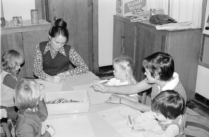 Bonnie Cook, left, and Linda Sprague, both new teachers at the Presbyterian Preschool, 512 Seventh St., work with youngsters during class time on Sept. 27, 1974.